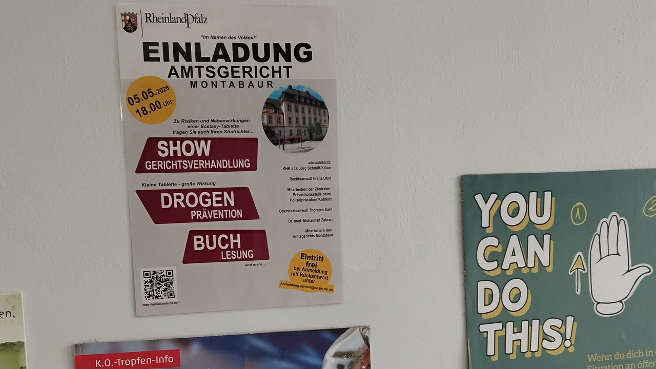 „Zu Risiken und Nebenwirkungen von Ecstasy fragen Sie Ihren Strafrichter“ ist das Motto der Show-Gerichtsverhandlung im Amtsgericht Montabaur. Ecstasy wird nicht selten als „Partydroge“ oder harmlose Designerdroge dargestellt. Weit verbreitet sind die bunten Pillen mit unberechenbaren pharmakologischen und toxikologischen Eigenschaften der Amphetaminmischungen. Bereits Ecstasy-Besitz ist strafbar, das Überlassen zum Verbrauch umso mehr insbesondere bei Körperverletzungen.